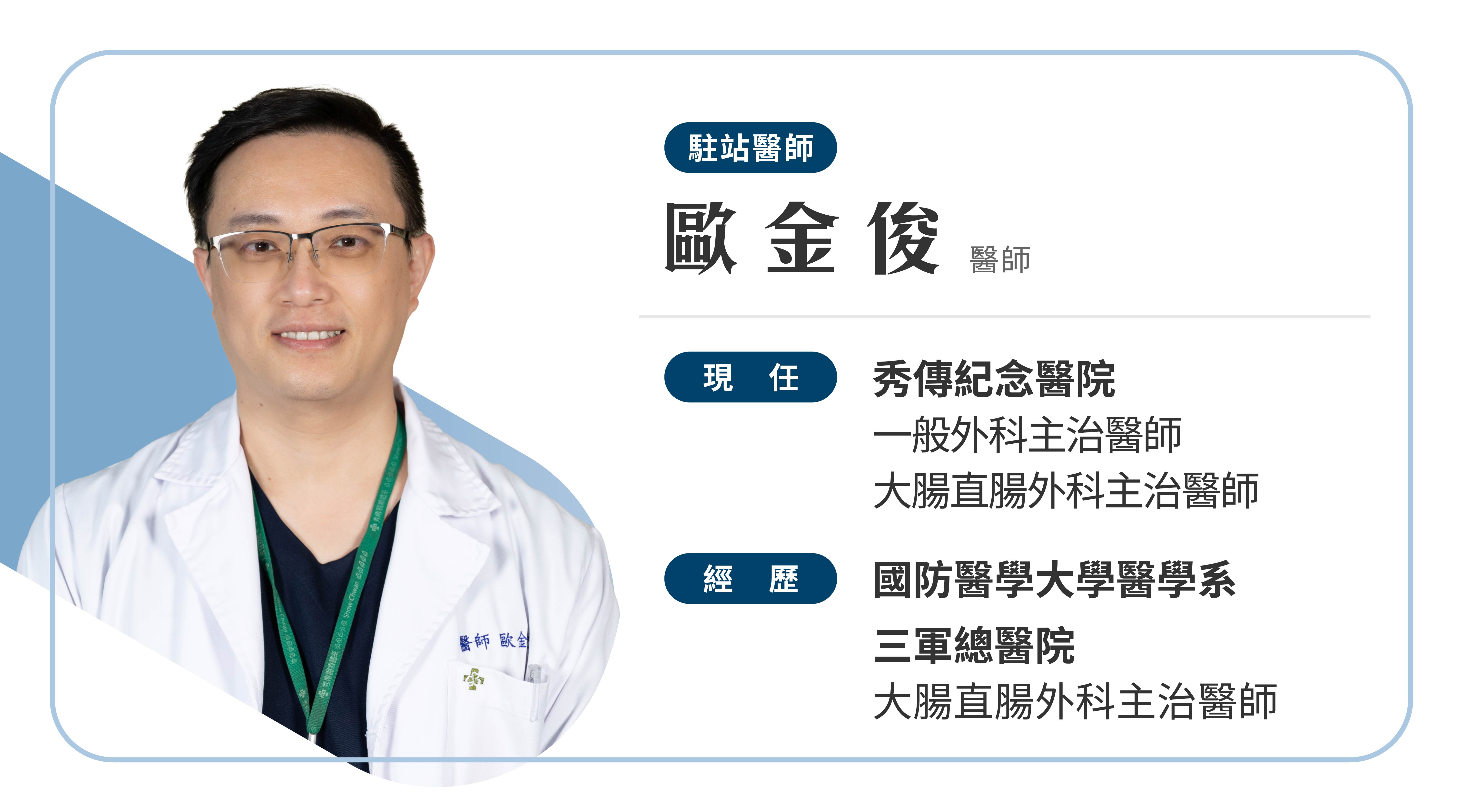 歐金俊醫師現任秀傳紀念醫院一般外科與大腸直腸外科主治醫師,擁有豐富的大腸直腸手術經驗與臨床專業背景,致力於大腸癌、直腸癌等消化道惡性腫瘤的精準診斷與個別化治療。歐醫師同時擅長肛門疾病、發炎性腸道疾病及微創手術,提供全方位且細緻的外科醫療照護。